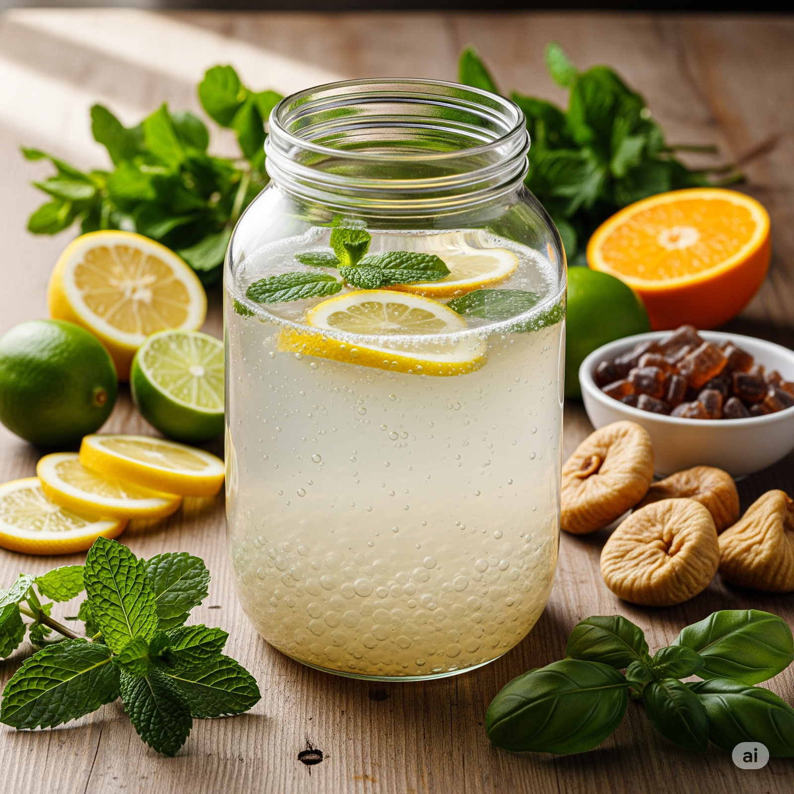 Maak zelf Dennentop & Honing Jun: een unieke, bosachtige probiotische drank. Ontdek hoe je de frisse smaken van den combineert met Jun.